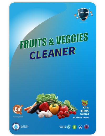 Introducing CuRaksha Fruits & Vegetables Cleaner, a high-efficiency, water-based solution designed to remove harmful germs, dirt, wax, pesticides, and chemical residues from your fresh produce. Powered by advanced Nano Copper technology, this gentle yet powerful cleaner ensures your fruits and vegetables are safe, healthy, and ready to eat. It effectively kills 99.99% of germs and bacteria, preserves the produce’s natural taste and freshness, and is completely safe, skin-friendly, and alcohol-free. CuRaksha is an environmentally friendly, cost-effective, and NABL accredited formulation, giving you complete peace of mind.